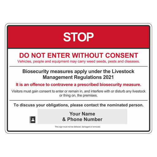 Advise visitors of the importance of following biosecurity procedures on your property. This Northern Territory Stop Biosecurity sign meets the lat...