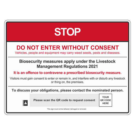 View full detailsBiosecurity Sign - Victorian Farm Biosecurity Management with Farm provided QR CODE