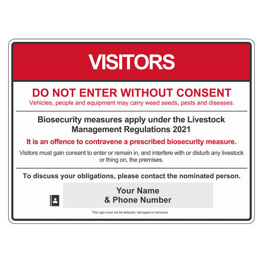 Advise visitors of the importance of following biosecurity procedures on your property. Please enter your Contact Name and Phone Number in the Cust...