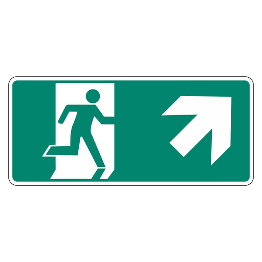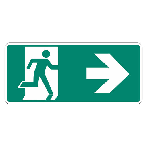 Arrow signs show employees, customers and guests where the nearest exit is when they want to leave the building or in case of evacuation. These incorporate a green background with white text and on accession a green figure on a while background. Both luminous and non-luminous materials are used.