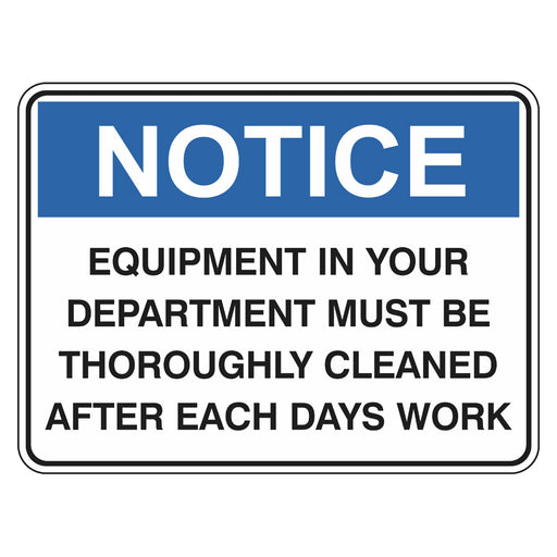 Notice Sign - Equipment In Your Department Must Be Thoroughly Cleaned After Each Days Work